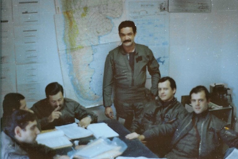 El brigadier Ernesto Crespo (quinto desde la derecha) cuando era un joven piloto de los caza Calquin en su Mendoza natal. Entonces no intuía el desafío que enfrentaría muchos años después al mando del comando de la Fuerza Aérea Sur durante el conflicto de Malvinas.
