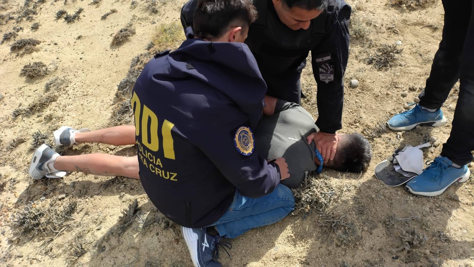Al notar la presencia policial, los ocupantes del Citroën C4 gris oscuro intentaron darse a la fuga, iniciando una persecución en la que participaron la DDI, la Comisaría Primera y Segunda, Bomberos y Prefectura Naval Argentina. La huida terminó en la zona del Monte Wood, a 7 kilómetros del casco urbano, donde los sospechosos abandonaron el auto y continuaron su escape a pie. Finalmente, fueron interceptados y detenidos por el personal de la DDI y Bomberos de Puerto San Julián. Se trata de un hombre de 30 años, residente de Río Gallegos, y una mujer de 20, oriunda de Laferrere, provincia de Buenos Aires. Ambos quedaron detenidos a disposición del Juzgado de Río Gallegos.