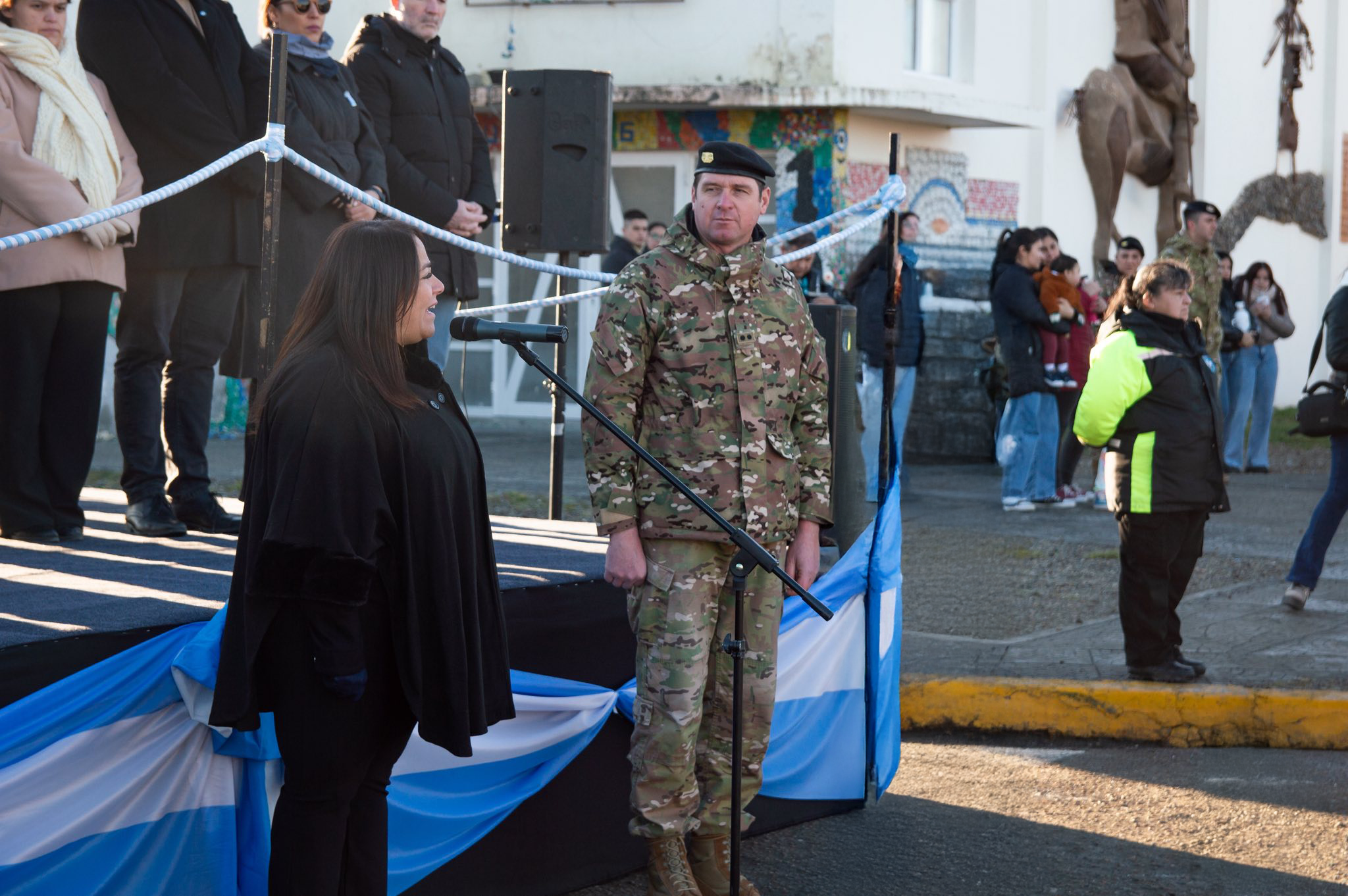 El acto fue encabezado por la intendente Analía Farías, quien estuvo acompañada por su gabinete, concejales del Honorable Concejo Deliberante y representantes de diversas fuerzas de seguridad, entre ellos el VGM Abel Pillancar, integrantes de la Guarnición Ejército Piedra Buena, la Banda Militar local, Gendarmería Nacional, Prefectura Puerto Santa Cruz, Policía de Santa Cruz, División de Operaciones Rurales y Bomberos Unidad 15.